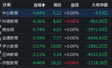 此外,教育股持续走低,中公教育触及跌停,科德教育、豆神教育、美吉姆、学大教育等跌超5%。