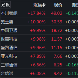 受益全国两会利好消息发酵,6G概念再度走强,板块上涨近5%。个股来看,本川智能涨超10%,世嘉科技、盛路通信涨停。