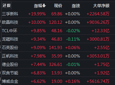 赛道股集体回暖,光伏概念冲高,三孚新科“20cm”涨停,欧晶科技涨停,TCL中环逼近涨停,龙磁科技、石英股份等跟涨。