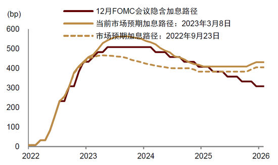 图表:市场加息路径预期高于12月FOMC指引