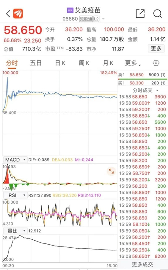 3月13日早盘,港股艾美疫苗盘初涨幅超180%,至100港元,创上市新高,市值一度升至千亿港元。截至收盘,艾美疫苗涨幅达65.68%,总市值为710.3亿港元,成交额为1.14亿港元。自3月7日以来,艾美疫苗5个交易日累计涨幅翻倍。