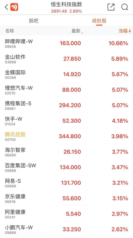 大型科技股中,哔哩哔哩-W涨10.66%,金山软件涨5.89%,理想汽车-W涨5.07%,腾讯控股涨3.98%,百度集团-SW涨3.47%,阿里巴巴涨2.59%。