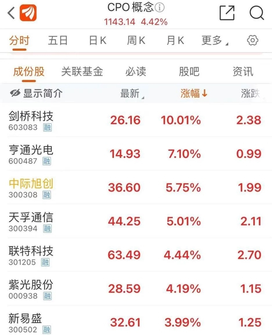 受益于ChatGPT爆火后带来的高算力需求,CPO概念最近被市场爆炒。今日早盘,CPO概念再度异动拉升,截至午盘休市,剑桥科技涨停,亨通光电涨超7%,中际旭创涨超5%。