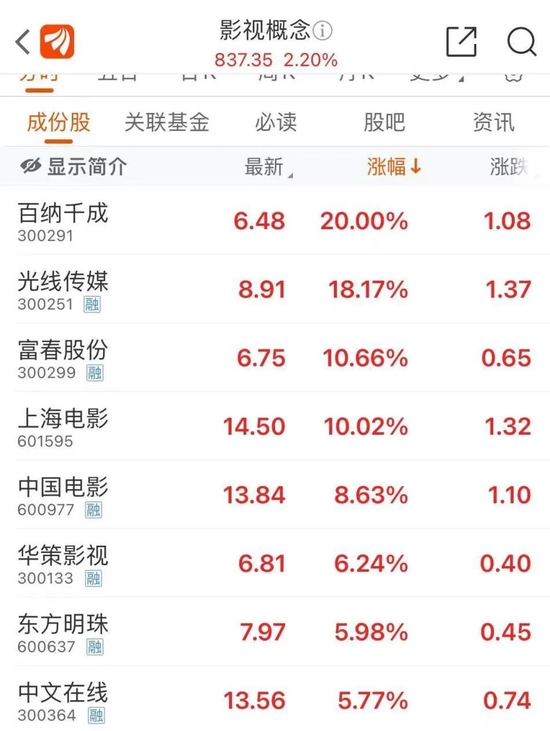 影视股盘中也集体拉升,截至午间收盘,百纳千成20%涨停,光线传媒盘中一度触及20%幅度涨停,上海电影涨停,中国电影、华策影视跟涨。