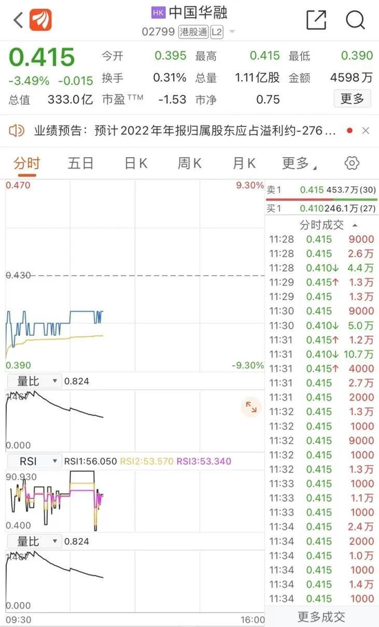 今日早盘,国内最大的AMC(不良资产处理)公司之一中国华融开盘跌超8%,截至发稿跌幅缩窄至3.49%。消息面上,3月19日晚,中国华融发布业绩预告:经初步测算,该集团2022年度归属于公司普通股股东的净亏损预计为276亿元左右。其中,2022年下半年较上半年实现减亏101亿元左右。