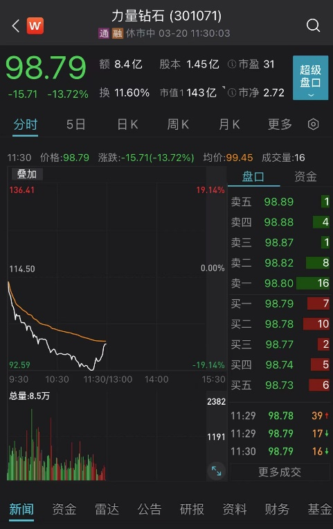 今天上午,力量钻石下跌13.72%,盘中跌超19%,最新市值为143亿元。