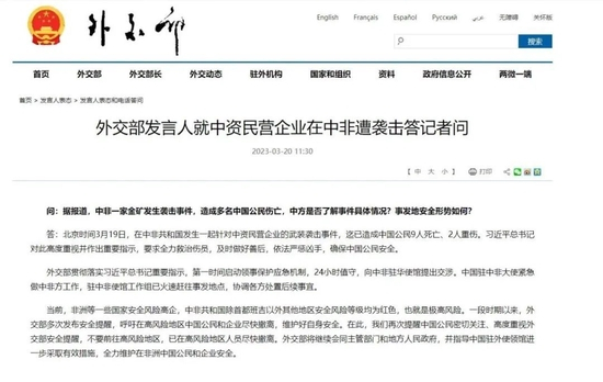 据报道,中非一家金矿发生袭击事件,造成多名中国公民伤亡。外交部发言人今日就中资民营企业在中非遭袭击答记者问表示,北京时间3月19日,在中非共和国发生一起针对中资民营企业的武装袭击事件,迄已造成中国公民9人死亡、2人重伤。