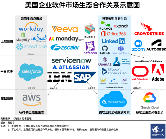 一家中国云厂商技术人士对《财经十一人》表示,美国软件市场,云厂商、平台软件厂商、中小软件厂商这三层蛋糕行业格局很明显。亚马逊、微软、谷歌三家头部云厂商,Oracle、Salesforce、SAP等平台软件厂商,以及数百家上层应用软件,每一层的生态都很完善且力量相对均衡。