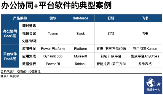 微软和Salesforce从企业软件出发,研发或收购了办公协同平台,建成“协同办公+PaaS平台”的生态。微软生产力与业务流程软件最核心的产品是“Teams+Dynamic365+Power Platform+Power BI”,Salesforce正在建设的软件产品线是“Slack+Platform+Mulesoft+Tableau”。