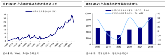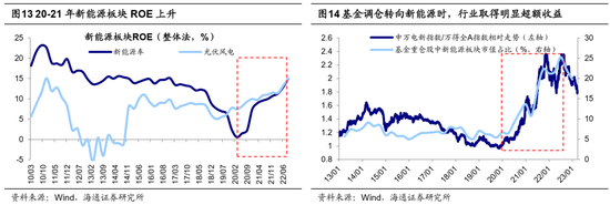 基金调仓转向新能源的背后是其景气度更高。从基本面看,政策支持+技术进步推动下,新能源产业周期逐步演绎,产业链基本面持续上行。光伏单晶PERC电池技术量产转换效率不断提升,风电机组的大型化持续为风力发电降本增效,新能源车的续航里程和电池组能量不断提升。技术进步是新能源大规模发展应用的基础,政策的支持也进一步加速了新能源产业的渗透。风电光伏方面,20年我国风电新增装机量增速达178%,光伏新增装机量增速达60%。新能源车方面,21年新能源汽车销量达352万辆,较20年同比增长157%,新能源汽车渗透率也达到19%,较20年的9%大幅提升。新能源产业链高景气在上市公司业绩上也逐渐体现,新能源车ROE从20Q1的0.6%上升至21年的10%以上,风电光伏ROE从19Q1的5%上升至21年的11%左右。从市场面看,20年初新能源板块估值、基金配置力度都不算高。估值方面,光伏风电PE估值为26倍,处13年以来15%分位。基金配置方面,20Q1基金重仓股中新能源板块市值占比为6.4%,略低于13-19年间均值的6.7%;相对自由流通市值的超配比例为0.9个百分点,接近13-19年间均值。随着新能源产业周期逐步演绎,产业链基本面持续上行,估值和基金配置力度都不高的新能源板块迎来公募基金的明显增持。随着基金加大对新能源的配置力度,新能源板块相对市场取得明显超额收益,20-21年申万电新指数累计涨幅达188%,同期万得全A指数为37%。