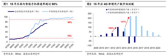 15-16年公募持仓从TMT转向白酒,调仓持续4个季度。15-16年移动互联周期结束,产业链基本面开始下滑。15年末智能移动设备产业发展进入成熟期,智能手机渗透率突破90%,此后智能手机销量震荡下滑,渗透率的提升开始放缓甚至停滞,TMT产业链基本面开始下滑。如计算机、传媒ROE从15Q4的高位开始回落,计算机ROE从15Q4的11.1%下降至18Q4的6.6%,传媒ROE从15Q4的12.8%下降至19Q3的-3.5%。TMT基本面下滑也导致公募基金开始大幅调仓,基金重仓股中TMT行业占比从15Q4的30.8%大幅下降至16Q4的20.3%,相对自由流通市值的超配力度也从15Q4的15.3个百分点下降至16Q4时的5.8个百分点。17-19年TMT在基金重仓股中占比维持在20%左右的水平,可见这次公募基金大规模减仓TMT持续了4个季度。从TMT细分行业来看,前期基金配置力度上升较多的计算机和传媒减仓也更多,基金重仓股中计算机行业占比从15Q4的15.8%大幅下降至16Q4的6.9%,基金重仓股中传媒行业占比从5.8%下降至2.8%。此后基金重仓的方向逐渐转向以白酒为代表的消费板块,基金重仓股中白酒行业占比从15Q4的1.3%上升至20Q4的15.8%。