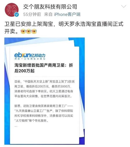 今日上午,“交个朋友科技有限公司”微博号发文称:卫星已安排上架淘宝,明天罗永浩淘宝直播间正式开卖。资料显示,“交个朋友”是一家网红直播带货平台,主要以具有创新型的数码科技产品、优秀文创产品以及兼具设计和实用性的家居杂货为主。