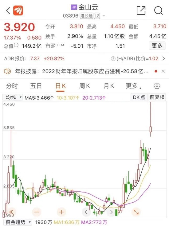 今日早盘,金山云盘中涨超23%,盘中股价创下上市以来新高,报4.18港元/股。截至发稿,金山云涨17.37%。自3月13日以来,14个交易日,金山云股价几乎翻倍,累计涨幅为94.02%。