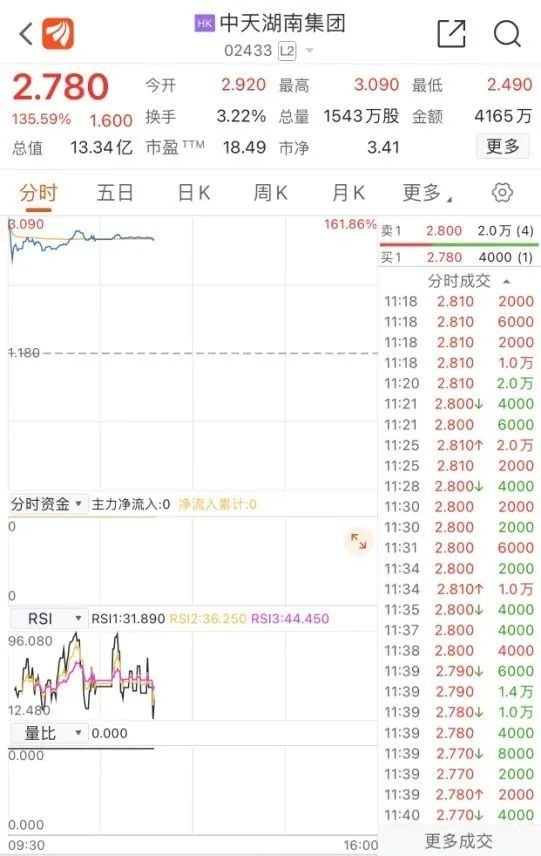 3月30日,中天湖南集团在港交所上市,开盘涨147.46%,成为今年港股涨幅最高的新股,现报2.78港元/股,每手2000股,打新一手账面浮盈3200港元。最新总市值13.34亿港元,该股昨日暗盘收涨127.12%。