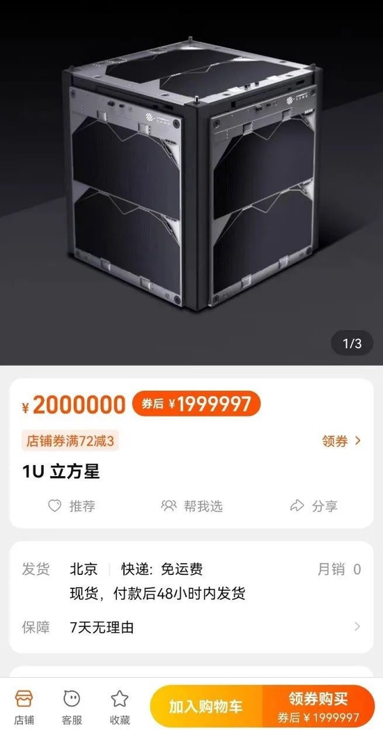 目前,“中国航天太空上新”淘宝店上架了3款民用卫星,最低价200万元,消费者均可直接下单购买。航天卫星通过电商平台面向大众销售,在世界范围内尚属首次。据媒体报道,这批卫星由我国首家商用卫星工厂“九天微星唐山卫星工厂”生产,除了供科研院所和学校用来科研教学外,消费者还可以购买“太空拍照”等个性化服务。