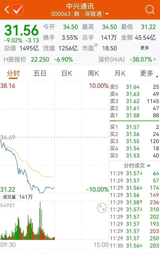 中兴通讯早盘触及跌停
