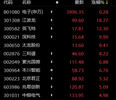 早盘市场亮点主要集中在半导体板块。截至午间休市,申万电子行业指数上涨0.28%,江波龙、英飞特涨超10%,深科技涨停,紫光国微、本川智能等涨超6%。