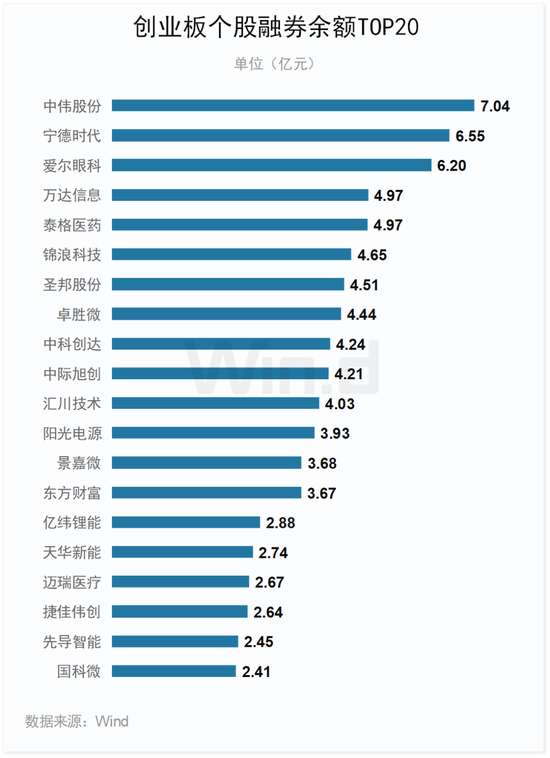 从融券余额来看,中伟股份融券余额为7.04亿元,位居榜首。此外宁德时代、爱尔眼科融券余额居前,分别为6.55亿元、6.20亿元。