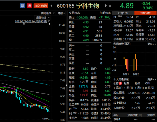 今日早盘,宁科生物股价一字跌停,报4.89元,总市值33亿元。