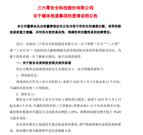 午间,三六零发布澄清公告称,周鸿祎先生作为上市公司实控人,承诺于2023年4月4日起未来12个月内,不减持其持有的三六零股份。胡欢女士作为持有上市公司5%以上股份的大股东,承诺于2023年4月4日起未来6个月内,不减持其持有的三六零股份;即便未来6-12个月内有相关计划,减持股份数量亦不超过公司总股本比例的1.25%,将维持持股比例不低于5%的大股东身份。截至本公告披露日,公司生产经营正常,货币资金充足,前次募集资金尚未使用完毕,募投项目正在有序进行中,没有再次发行股份募集资金的计划。