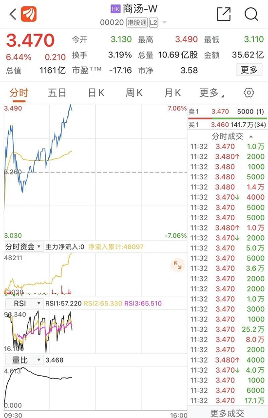 4月6日开盘,商汤-W跌3.99%,随后快速拉涨,9时40分涨超4%,领涨恒生科技指数成份股。随后涨幅迅速回落,9时55分已跌近1%,显示资金分化剧烈。11时30分左右,商汤-W涨超7%,截至发稿涨6.44%,成交额为35.62亿港元,而同时段腾讯控股成交额仅为25亿港元。目前商汤-W股价已达到2022年7月以来的高点。