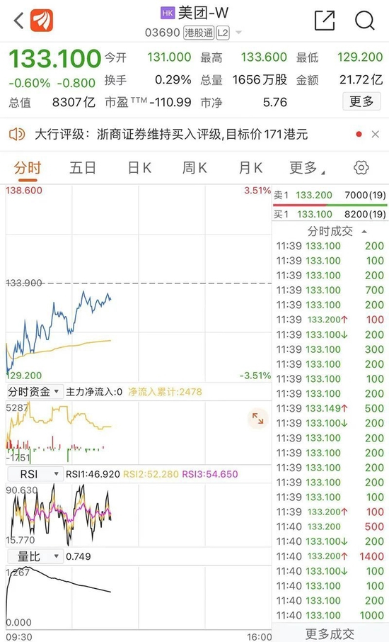 今日早盘,美团-W盘中一度跌2.91%,截至发稿跌0.6%,近5个交易日跌近5%。