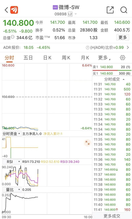 近日,微博-SW股价连续三个交易日下跌,累计跌超18%。今日早盘,微博-SW跌超6%,截至11时40分成交额仅为400.5万港元,总市值为344.6亿港元。