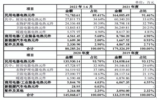 报告期各期,公司民用电器电热元件收入分别为12.406亿元、13.593亿元、16.401亿元和7.178亿元,占主营业务收入的比例分别为93.12%、93.70%、91.46%和89.41%,是公司最主要的收入来源;公司商用电器/工业装备电热元件收入分别为6,067.35万元、5,844.70万元、8,784.20万元和4,561.45万元,占主营业务收入的比例分别为4.55%、4.03%、4.90%和5.68%;2020年-2022年1-6月,新能源汽车电热元件收入分别为28.95万元、1667.52万元和1609.30万元。