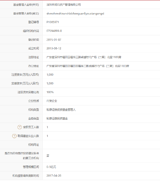 据中基协备案信息,润石资产成立于2013年8月,2015年1月备案为证券投资类私募基金管理人。