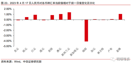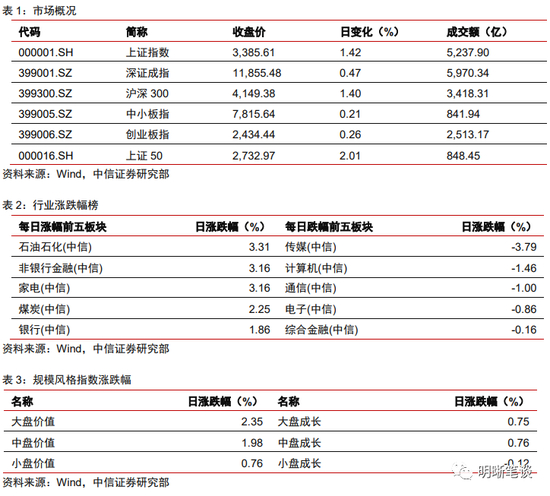 2023年4月17日,银存间质押式回购加权利率全面上行,隔夜、7天、14天、21天和1个月分别变动了19.82bps、4.17bps、12.94bps、7.88bps和1.37bps至1.81%、2.06%、2.15%、2.4%和2.37%。国债到期收益率全面上行,1年、3年、5年、10年分别变动0.5bps、1.19bps、1.2bps和1.51bps至2.21%、2.5%、2.69%和2.84%。上证综指上涨1.42%至3385.61,深证成指上涨0.47%至11855.48,创业板指上涨0.26%至2434.44。