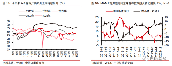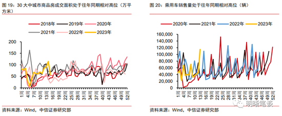 需求侧预期改善需要时间,而中期视角上我国经济陷入流动性陷阱的风险相对较低。无论是CPI非食品项涨价动能较弱,还是PPI上游工业品涨价节奏快于下游,都指向了当下国内需求弱修复的格局。2022年疫情扰动下居民端面临失业、可支配收入下降的问题,尽管2023年防疫优化措施全面落地而疫情冲击消退,但这类问题长尾影响并未快速消除。然而在经济稳步修复的大趋势下,需求侧的改善也在逐步显现。高频数据方面30大中城市商品房成交面积已经回升至往年同期的新高,乘用车销量也延续抬升,可见需求侧改善是渐进式的过程,需要更多时间显现。综上所述,中期视角上我国陷入流动性陷阱的可能性相对有限。