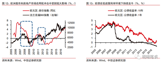 欧洲央行在次贷危机前后的政策取向相对克制。欧盟在2008年至2009年间同样经历了快速降息、CPI和产出缺口下降、股市和房市的暴跌以及债市走牛,但不同的是欧洲央行在降息决议上保持了一定的克制;在2008年末美联储已将政策利率降至0.1%以下时,欧元区再融资利率仍有2.5%,并在随后保持在1%至2%的区间运行,为货币政策留有一定的调整空间。