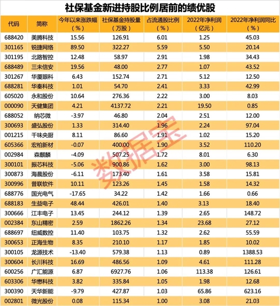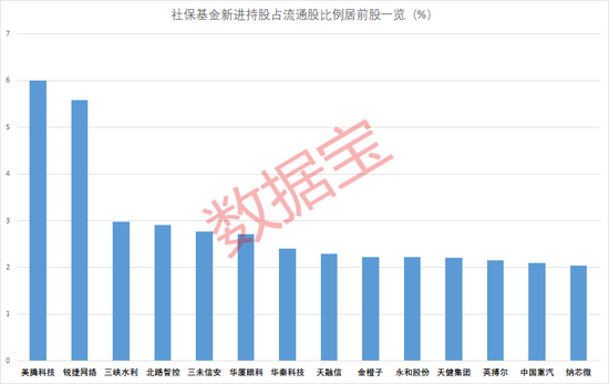 从持股比例看,新进股中,社保基金持有比例最多的是美腾科技,持股量占流通股比例为6.01%;其次是锐捷网络,社保基金持股比例为5.59%。持股比例居前的还有三峡水利、北路智控、三未信安等。