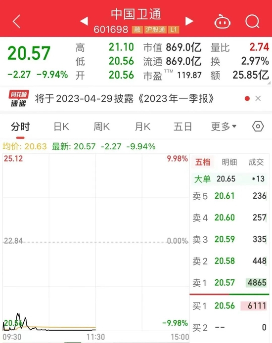6G概念股中国卫通早盘跌停。今日,中国卫通有2.24亿股的限售股份解禁上市,为公司定向增发机构配售股份,占公司总股本5.31%。今年以来,受国企央企估值修复、6G通信概念等影响,中国卫通股价累计涨幅达80.12%,目前总市值为869亿元。