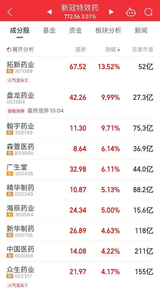 中药板块以及新冠药概念股开盘大涨,拓新药业涨超10%,盘龙药业涨停。