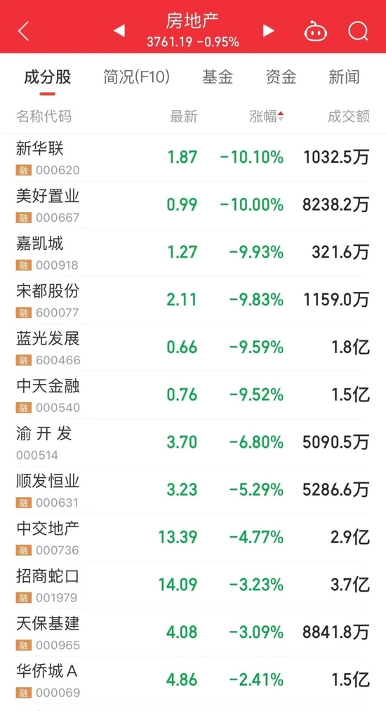 房地产板块震荡走低,新华联连续四个交易日一字跌停,嘉凯城连续3跌停;蓝光发展盘中触及跌停,渝开发、中交地产、天保基建、天房发展等跟跌。