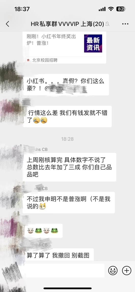 一张上海HR圈子的聊天记录流出,有疑似某书的HR在群里分享说,刚核算完年终奖,今年公司年终奖成本比以往多三成。