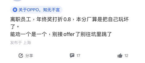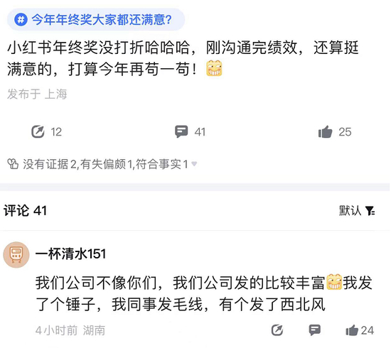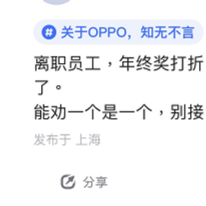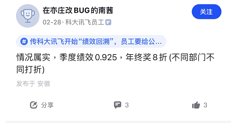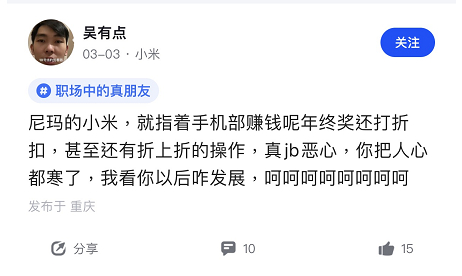 某社交平台上的讨论显示,今年美团0年终的人不少,滴滴取消了每年3月的普调,小米、oppo、科大讯飞都被员工吐槽年终奖打折。