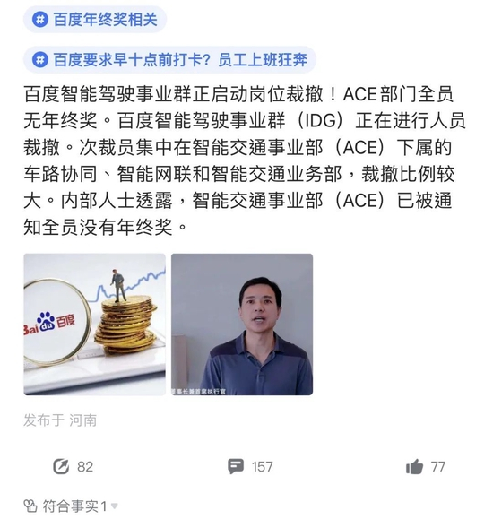 有网友分享,腾讯平台与内容事业群(PCG)、微信事业群(WXG)等多个事业群年终奖或低于去年水平;百度智能交通事业部(ACE)全员收到通知,无年终奖,智能驾驶事业部(IDG)进行了人员优化,而且比例还比较大,被裁的员工无年终奖;华为造车部门和消费者业务群(CBG)年终奖降幅最大。