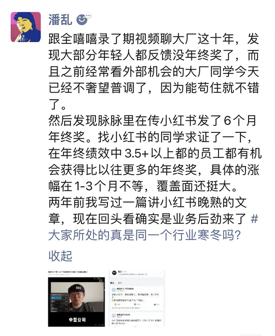 在行业整体去肥增瘦、收紧预算的背景下,小红书能给员工增发年终奖是比较良心的,用潘乱的话说就是“业务后劲来了”。