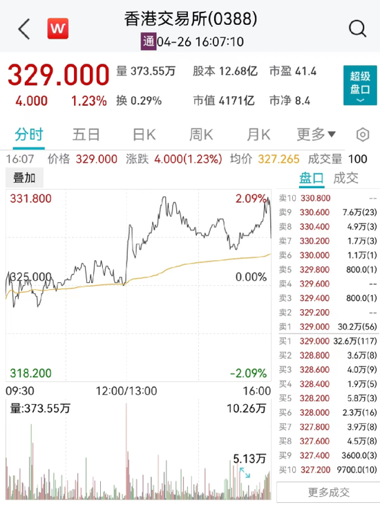 4月26日午后,香港港交所公布2023年第一季业绩,集团季度收入和其他收益及溢利为历来第二高,仅次于2021第一季的纪录。港交所股价在午后的交易大幅上涨,最高涨2.09%报331.80港元,随后涨幅收窄,收报329.00港元,涨1.23%。