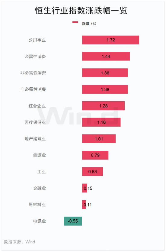 从行业表现看,恒生行业指数日内多数上涨,公用事业涨1.72%,必需性消费涨1.44%,非必需性消费涨1.38%。跌幅方面,电讯业跌0.55%。