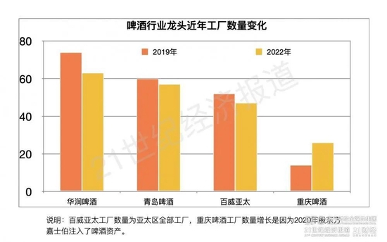 在产能端,21世纪经济报道梳理注意到,仅华润啤酒、青岛啤酒两大行业龙头,过去三年就关掉了14家啤酒厂,年产能减少210万千升以上。