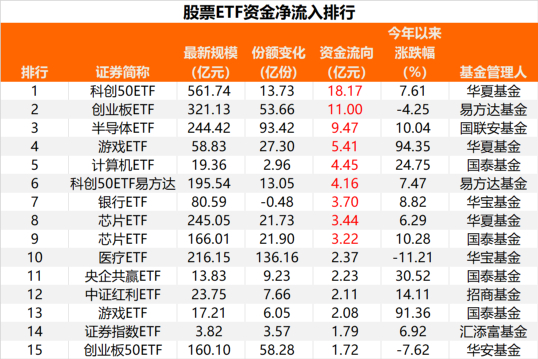 其中,科创50ETF、创业板ETF,以及半导体ETF、游戏ETF、计算机ETF等行业指数产品受到资金青睐。