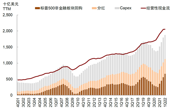 分红存在粘性导致并非所有“现金牛”公司都愿意进行高分红。美股公司良好的现金流水平是公司大量通过回购与分红回馈股东的主要支撑,但从行业层面来看,大量使用股票回购更常见于科技、医药和可选消费等偏成长领域。而通常只有商业模式成熟,不需要大量投资和资本支出,且盈利和现金流非常稳定的公司才愿意采用高比例分红的政策,因为投资者对稳定的分红具有较强的粘性,通常不愿意接受股利的削减,部分学术研究也发现了这一点[2]。因此对于现金流相对充裕的美股科技巨头,也会因为担忧业绩和资本支出的周期性波动而避免高分红。