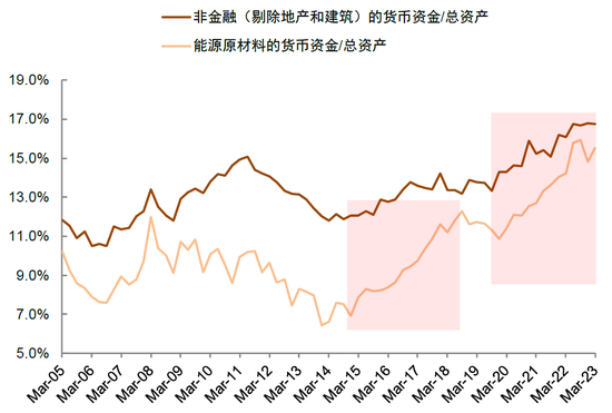 图表32:A股非金融企业现金占比升至历史高位,能源原材料行业上升幅度更大