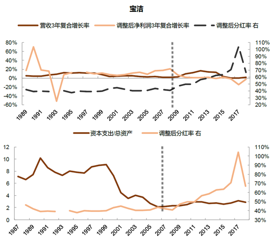 图表31:宝洁在增长放缓和资本开支降至低位后,也开始提升分红比例