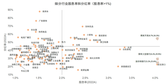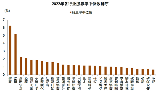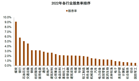 高股息板块多位于相对成熟的传统行业。从股息率维度,截至以2022年公布的股利发放为基准,股息率最高的五个行业是煤炭(9.1%)、银行(5.8%)、石油石化(5.1%)、交通运输(4.6%)和钢铁(3.2%),多为与经济周期高度关联的传统行业。但如果考虑部分行业2022年业绩下滑造成低基数,以及大型权重公司影响,从股息率中位数维度排名前5的行业分别是煤炭(6.3%)、银行(5.2%)、纺织服装(2.2%)、钢铁(2.2%)和家用电器(1.9%)。