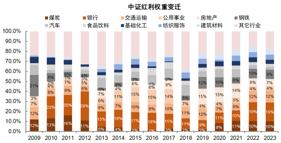 图表20:中证红利的权重行业变迁较大,前三大权重主要包括银行、房地产、煤炭、交通运输、公用事业和钢铁等行业