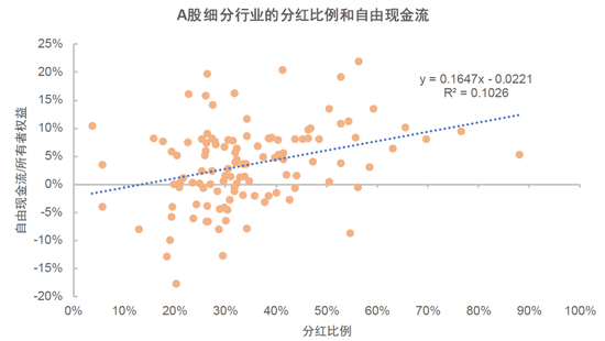 图表34:A股细分行业的分红比例和自由现金流/所有者权益高度正相关